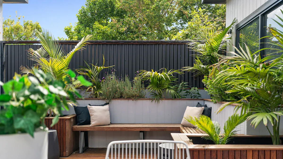 You can design a private nook that feels like your own outdoor sanctuary. Artificial turf makes the space feel lush and comfortable, even in the smallest yards. Use tall planters or trellises to add privacy and block outside views. For a Mediterranean touch, use warm colors and potted plants to create a coastal vibe.